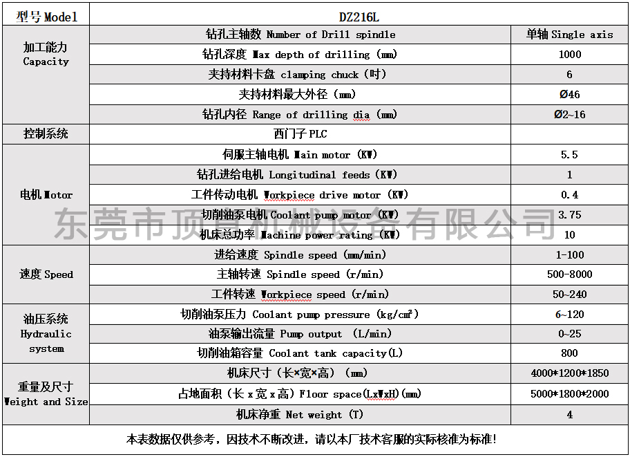 1.DZ216L专为超长司筒和斜顶杆厂家设计制造 ; 2.钻孔内径2.0—16.0mm,钻孔深度1000mm; 3.机器床身和导轨铸件经过两年以上自然时效,确保机器的性能更稳定; 4.主要零部件从欧、美、日及台湾进口; 5.控制系统:西门子NC或新代CNC; 6.提供品牌深孔钻油、进口枪钻、导向钢套和顶真胶套等配套服务。 深孔钻DZ-216L参数表:
