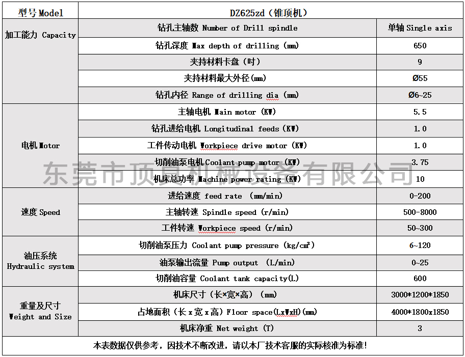 1.DZ625zd适合钻热流道料咀和机械轴,夹持采用锥顶方式,可定制2轴和4轴。 2.钻孔内径6.0-25.0mm,钻孔深度650mm 3.机器床身和导轨铸件经过两年以上自然时效,确保机器的性能更稳定 4.主要零部件从欧、美、日及台湾原装进口 5.三轴伺服及个性化新代控制系统,确保操纵的最佳性 6.提供品牌深孔钻油、进口枪钻、导向钢套和顶真胶套等配套服务。 顶真深孔钻DZ625zd参数表: