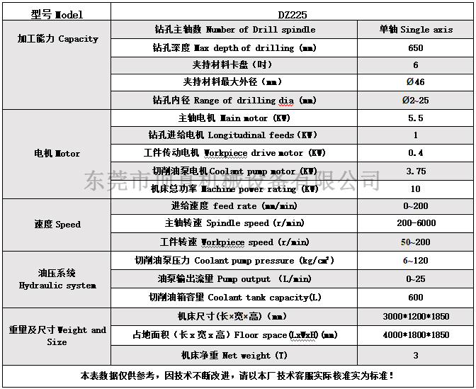 1.DZ225专业为生产轴类产品中空孔厂家设计制造; 2.钻孔内径2.0-25.0mm ,钻孔长度650mm; 3.机器床身和导轨铸件经过两年以上自然时效,确保机器的性能更稳定; 4.主要零部件从欧、美、日及台湾进口; 5.控制系统:西门子NC; 6.提供品牌深孔钻油、进口枪钻导向钢套和顶真胶套等配套服务。 顶真深孔钻DZ225参数表