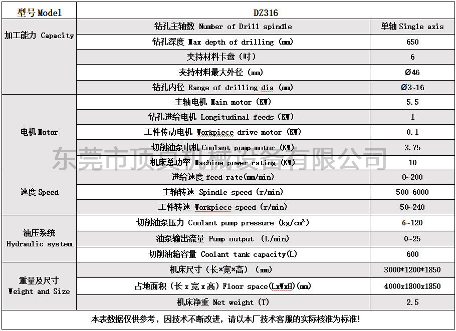 1.DZ316专业为生产司筒厂家设计制造; 2.钻孔内径3.0-16mm ,钻孔长度650mm; 3.机器床身和导轨铸件经过两年以上自然时效,确保机器的性能更稳定; 4.主要零部件从欧、美、日及台湾原装进口 5.控制系统:西门子NC 6.提供品牌深孔钻油、进口枪钻、导向钢套和顶真胶套等配套服务 顶真深孔钻DZ316参数
