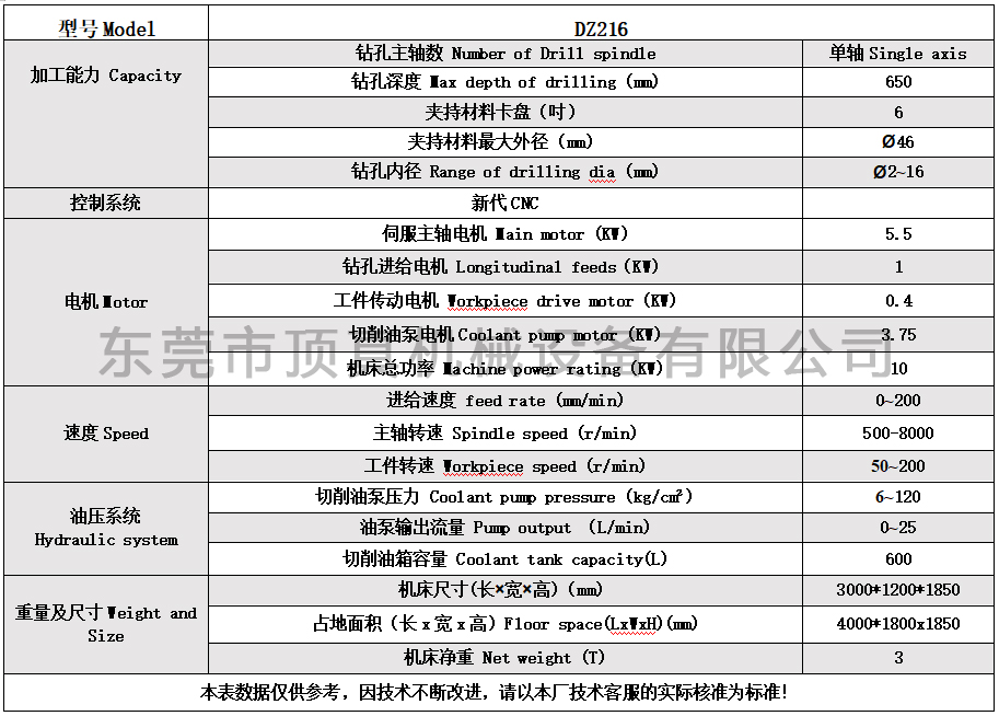 1.DZ216专业为生产司筒厂家设计制造 2.钻孔内径2.0-16.0mm,钻孔长度650mm 3.机器床身和导轨铸件经过两年以上自然时效,确保机器的性能更稳定; 4.主要零部件从欧、美、日及台湾原装进口 5.采用新代系统,自动加速,确保操作安全稳定 6.提供品牌深孔钻油、进口枪钻,导向钢套和顶真胶套等配套服务。 顶真深孔钻DZ216参数表