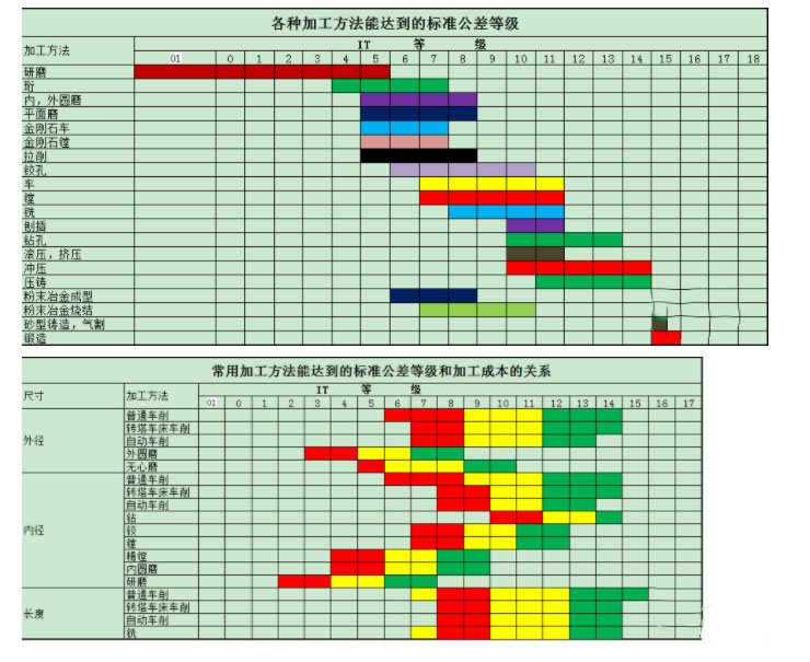车、铣、刨、磨、钻、镗,这些机床的最高精度和各种加工方法能达到的公差等级,都在这里了。 工件旋转,车刀在平面内作直线或曲线移动的切削加工。车削一般在车床上进行,用以加工工件的内外圆柱面、端面、圆锥面、成形面和螺纹等。 车削加工精度一般为IT8—IT7,表面粗糙度为1.6~0.8μm。 1)粗车力求在不降低切速的条件下,采用大的切削深度和大进给量以提高车削效率,但加工精度只能达IT11,表面粗糙度为Rα20~10μm。 2)半精车和精车尽量采用高速而较小的进给量和切削深度,加工精度可达IT10~IT7,表面粗糙度为Rα10~0.16μm。 3)在高精度车床上用精细修研的金刚石车刀高速精车有色金属件,可使加工精度达到IT7~IT5,表面粗糙度为Rα0.04~0.01μm,这种车削称为"镜面车削"。 铣削是指使用旋转的多刃刀具切削工件,是高效率的加工方法。适于加工平面、沟槽、各种成形面(如花键、齿轮和螺纹)和模具的特殊形面等。按照铣削时主运动速度方向与工件进给方向的相同或相反,又分为顺铣和逆铣。 铣削的加工精度一般可达IT8~IT7,表面粗糙度为6.3~1.6μm。 1)粗铣时的加工精度IT11~IT13,表面粗糙度5~20μm。 2)半精铣时的加工精度IT8~IT11,表面粗糙度2.5~10μm。 3)精铣时的加工精度IT16~IT8,表面粗糙度0.63~5μm。 刨削加工是用刨刀对工件作水平相对直线往复运动的切削加工方法,主要用于零件的外形加工。 刨削加工精度一般可达IT9~IT7,表面粗糙度为Ra6.3~1.6μm。 1)粗刨加工精度可达IT12~IT11,表面粗糙度为25~12.5μm。 2)半精刨加工精度可达IT10~IT9,表面粗糙度为6.2~3.2μm。 3)精刨加工精度可达IT8~IT7,表面粗糙度为3.2~1.6μm。 磨削是指用磨料,磨具切除工件上多余材料的加工方法,属于精加工,在机械制造行业中应用比较广泛。 磨削通常用于半精加工和精加工,精度可达IT8~IT5甚至更高,表面粗糙度一般磨削为1.25~0.16μm。 1)精密磨削表面粗糙度为0.16~0.04μm。 2)超精密磨削表面粗糙度为0.04~0.01μm。 3)镜面磨削表面粗糙度可达0.01μm以下。 钻削是孔加工的一种基本方法,钻孔经常在钻床和车床上进行,也可以在镗床或铣床上进行。 钻削的加工精度较低,一般只能达到IT10,表面粗糙度一般为12.5~6.3μm,在钻削后常常采用扩孔和铰孔来进行半精加工和精加工。 镗削是一种用刀具扩大孔或其它圆形轮廓的内径切削工艺,其应用范围一般从半粗加工到精加工,所用刀具通常为单刃镗刀(称为镗杆)。 1)对钢铁材料的镗孔精度一般可达IT9~IT7,表面粗糙度为2.5~0.16μm。 2)精密镗削的加工精度能达到IT7~IT6,表面粗糙度为0.63~0.08μm。 注:加工精度主要用于表征生产产品的精细程度,是评价加工表面几何参数的术语。衡量加工精度的标准为公差等级,从IT01,IT0,IT1,IT2,IT3至IT18一共有20个,其中IT01表示的话该零件加工精度最高的,IT18表示的话该零件加工精度是最低的 ,一般厂矿机械属于IT7级,一般农用机械属于IT8级。产品零部件按功用的不同,需要达到的加工精度不同,选择的加工形式和加工工艺也不同。