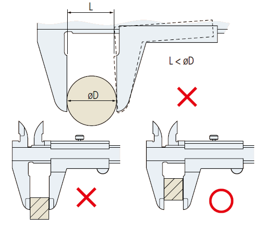 卡尺的读数轴和测量轴因不同轴而不符合阿贝原理,所以在使用卡尺时,用量爪的根部或尖端进行测量,会存在加大测量误差的危险。测量时需注意被测工件尽可能地接近尺身部分(读数轴)。