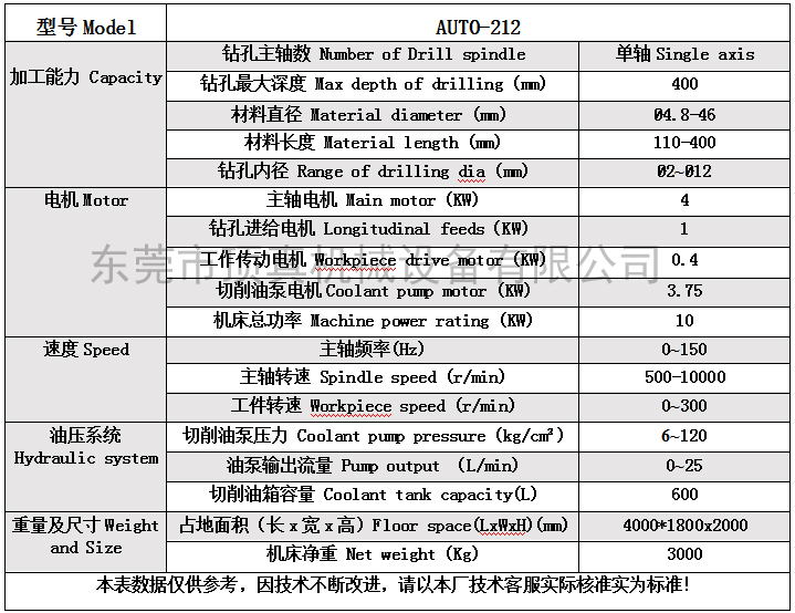 1.专业为批量生产的厂家设计制造,可订制2轴和4轴。 2.钻孔内径2.0-12.0mm,钻孔深度400mm; 3.机器床身和导轨铸件经过两年以上自然时效,确保机器的性能更稳定 4.主要零部件从欧、美、日及台湾原装进口,如气动SMC; 5.个性化西门子最新控制系统,确保操纵的最佳性 6.提供品牌深孔钻油、进口枪钻、导向钢套和顶真胶套等配套服务。 顶真深孔钻DZ Auto-212参数表