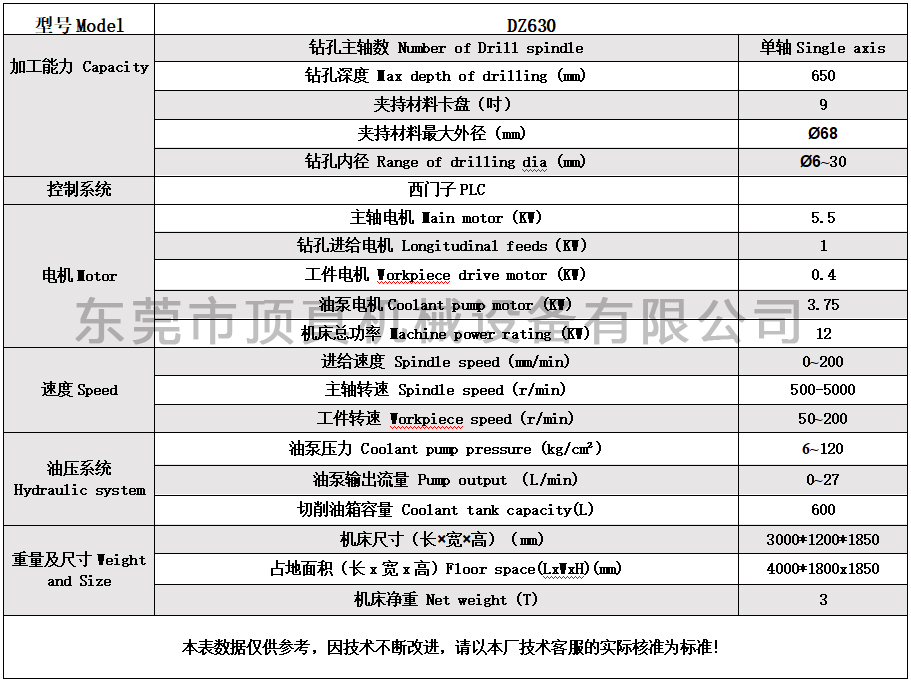 1.DZZ630专业为生产司筒厂家设计制造; 2.钻孔内径6.0-30.0mm ,钻孔长度650mm; 3.机器床身和导轨铸件经过两年以上自然时效,确保机器的性能更稳定; 4.主要零部件从欧、美、日及台湾原装进口; 5.控制系统:西门子NC; 6.提供品牌深孔钻油、进口枪钻、导向钢套和顶真胶套等配套服务。 顶真深孔钻DZZ630参数