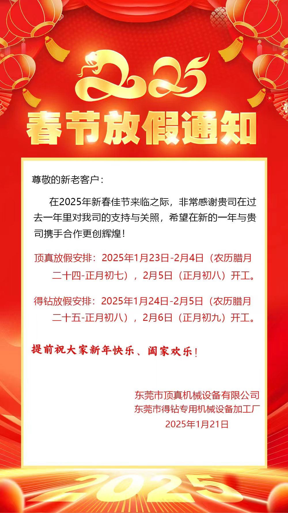 尊敬的各位新老客户,春节的脚步越来越近,我们也将迎来一年一度的春节长假。在这里,我们提前为大家送上春节的祝福,并告知大家2025年春节的放假安排,以便大家提前做好准备。