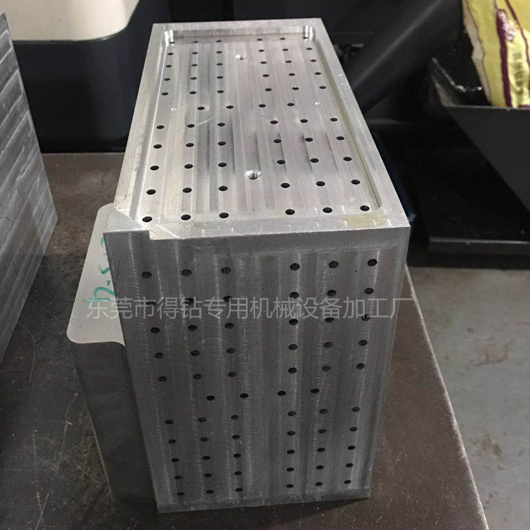 专业做深孔钻机床,可对外深孔钻模具加工,钻孔直径为3.0-30mm,长度为50-1000mm,精度是1000:1塑胶模具行业汽车合件,曲轴连杆,液压管道;(运水孔、顶针孔、热流道)。 加工材料:17-4、718H、738H、S136、P20、45#、FDAC、模具钢等易难切削料。 加工案例中可钻直径大小不同的孔,如图中有128个孔,孔的直径是4.0mm,深度皆不同从23到220mm;材料:铝块。