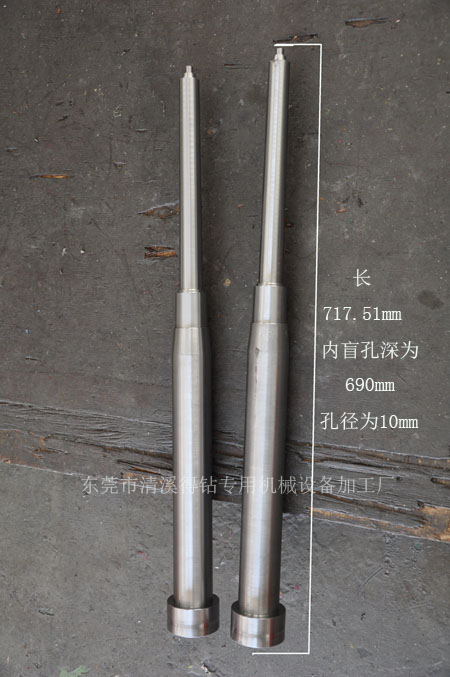 得钻深孔钻加工的优势: 1、钻孔机器10台 2、专业的钻孔团队 3、能达到高效率、高质量、精度高 4、可做急单、交货期短、交货快 5、可做批量单 6、能钻各种易、难切削料 深孔钻加工案例:材料长:717.51mm,钻孔直径为10mm,盲孔深690mm.